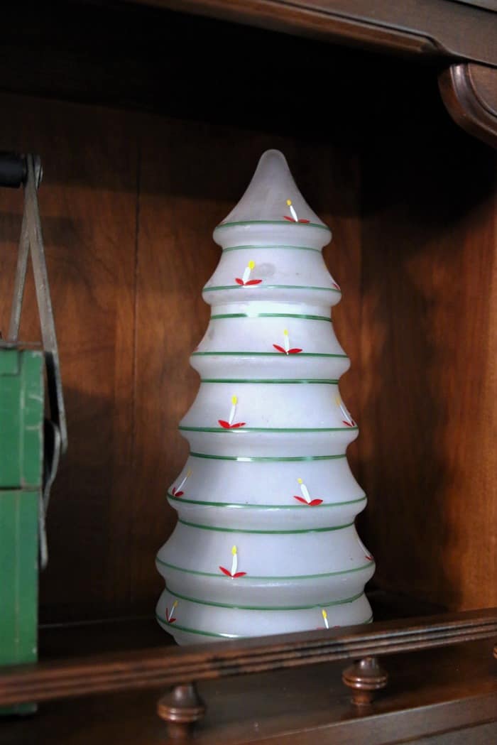 I purchased the glass Christmas tree at my favorite junk shop two or three years ago. I believe it is vintage but not really sure. I couldn’t find a similar piece online.