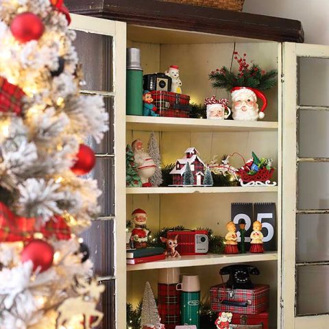 Decorate your china cabinet with vintage Christmas charm using a fun mix of classic thermoses, old-school lunchboxes, and a cheerful assortment of red and green treasures.