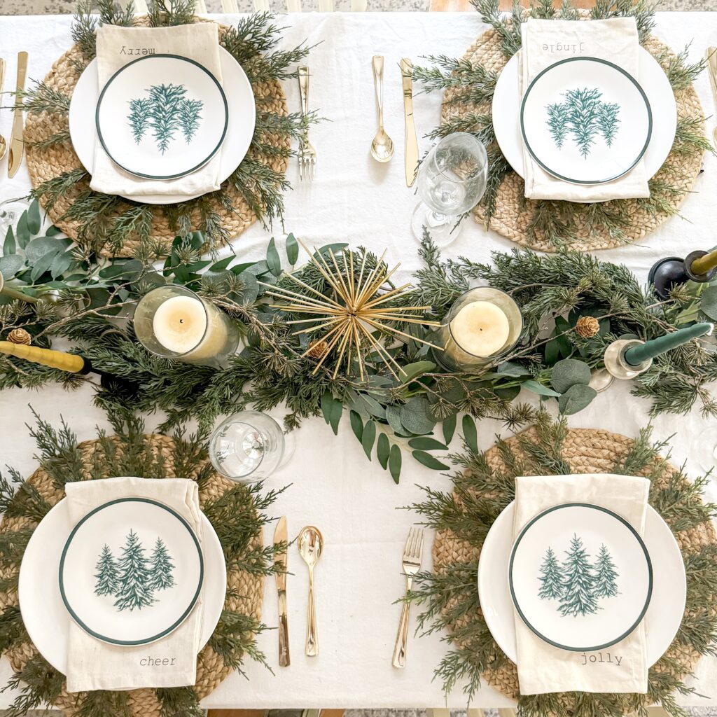 The combination of green, gold, and white in this Christmas tablescape brings timeless elegance to the holiday table.