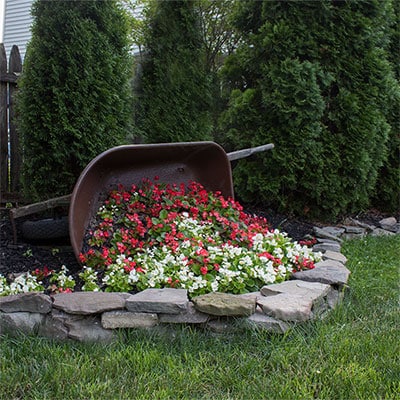 One way to make a statement in your garden is to create a focal point, like a tipped wheel barrow planter. It looks like the flowers are spilling out of it. So pretty!