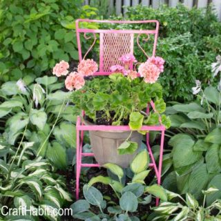 You know how much I love all things chippy and metal. This repurposed pink patio chair planter checks all the boxes!