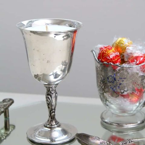 This gorgeous silver goblet makes an unexpected and elegant handmade candle. You can usually find these at thrift stores, yard sales and flea markets for just a few dollars.