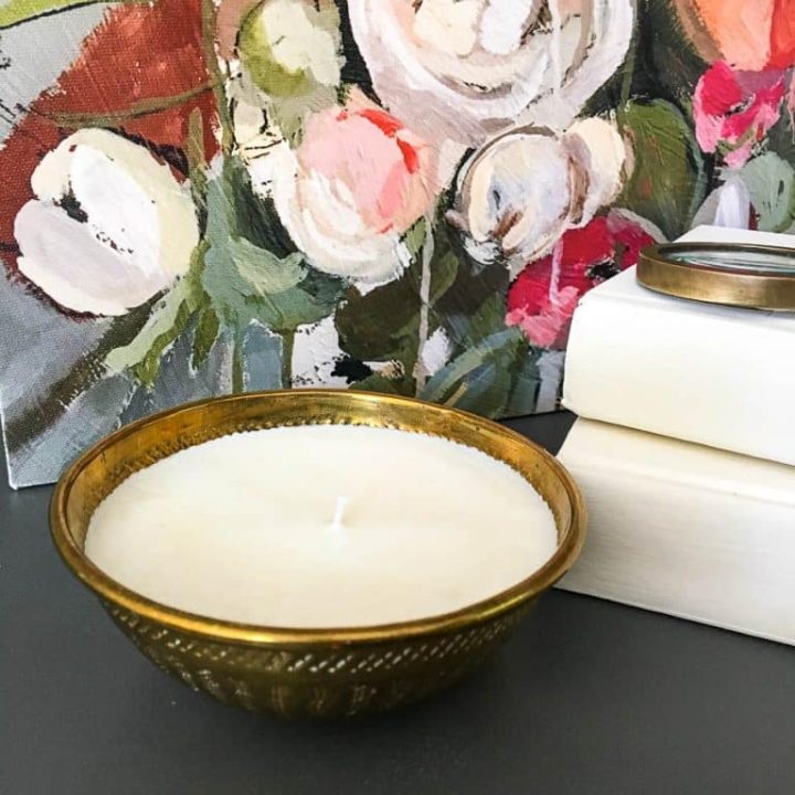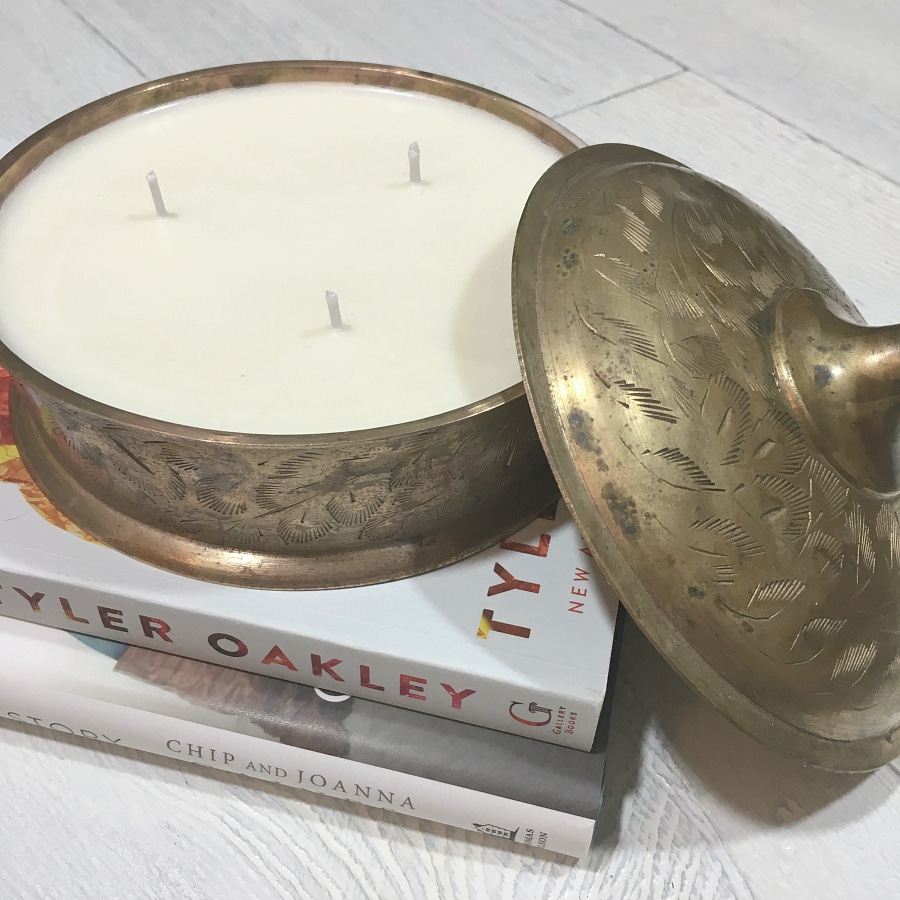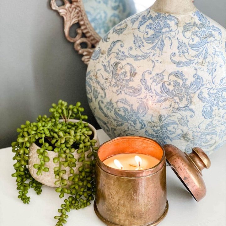 Lauren from Bless'er House repurposed a gorgeous brass canister into a handmade candle. The patina on this canister is just stunning and adds so much dimension to any vignette.