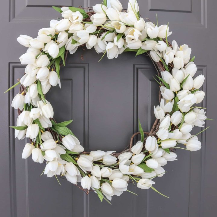 You can’t go wrong with a spring tulips wreath, especially in a neutral white. Or mix it up and add a pop of color in your ribbon or floral choice.