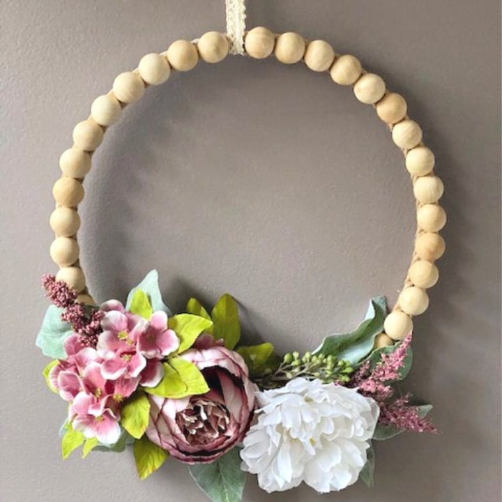 Upcycle an old embroidery hoop into a pretty floral wreath complete with wood beads.