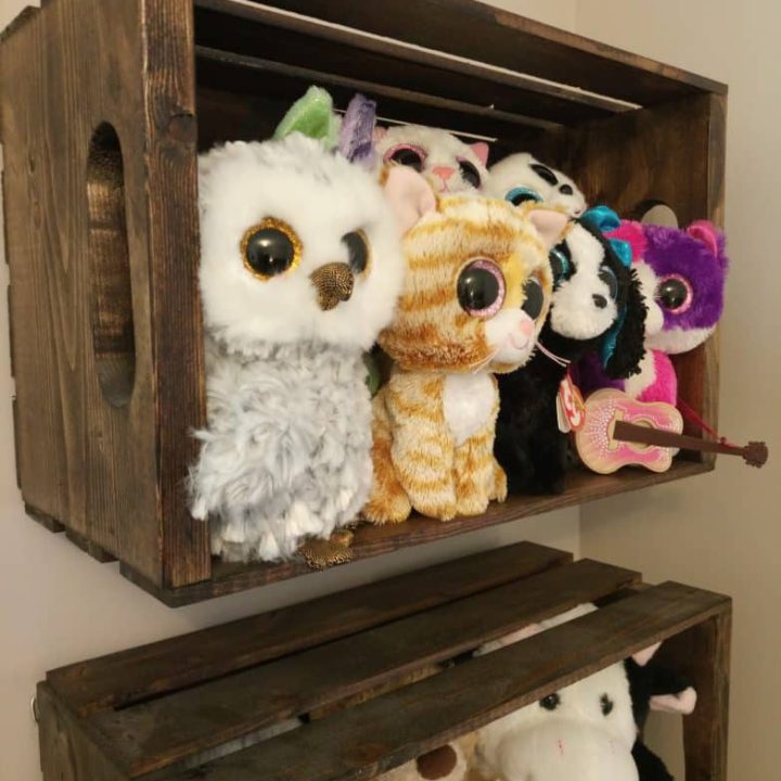 We all know how quickly stuffed animals can take over a child's room. One way to get them off the floor is to go vertical with storage. Wood crates are the perfect size!