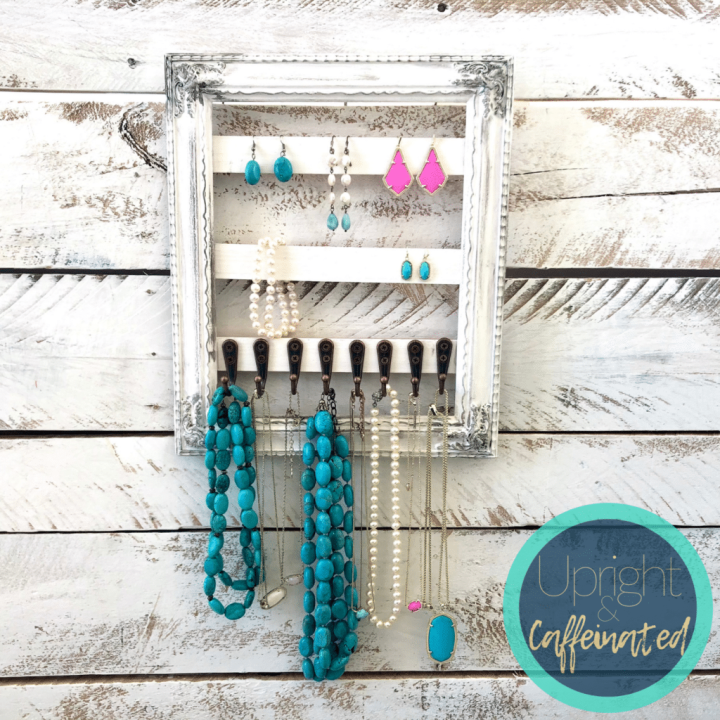 I had fun putting old junk stuff together to make this hanging necklace holder. This is an inexpensive upcycled project that is easy to make.