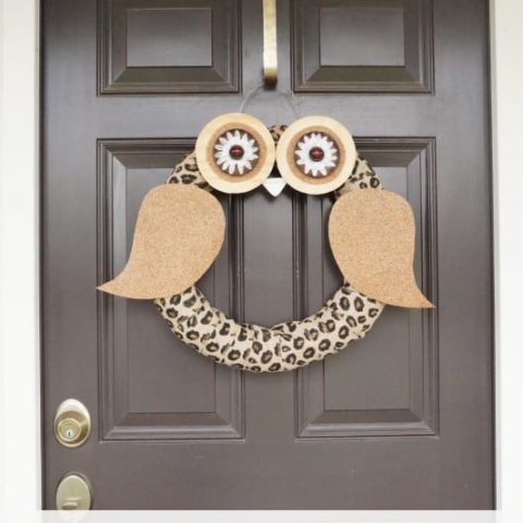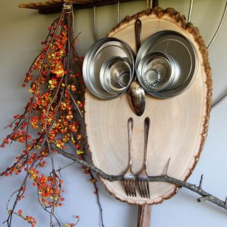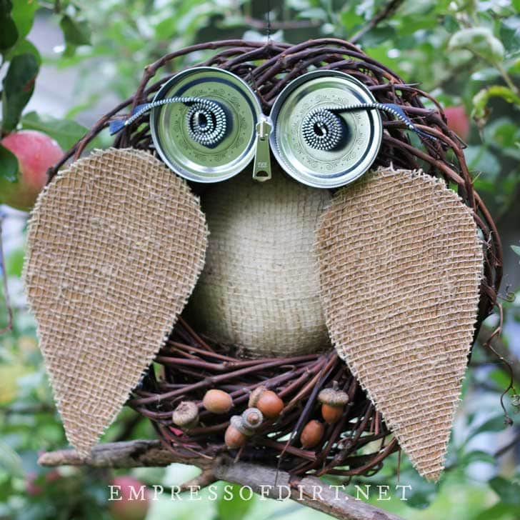 Use recycled materials from around the house to make a rustic owl wreath. Start with a grapevine wreath as the base and use old canning jar lids for the eyes. Add whatever you can find from your craft stash to make it your own one-of-a-kind piece!