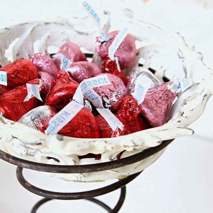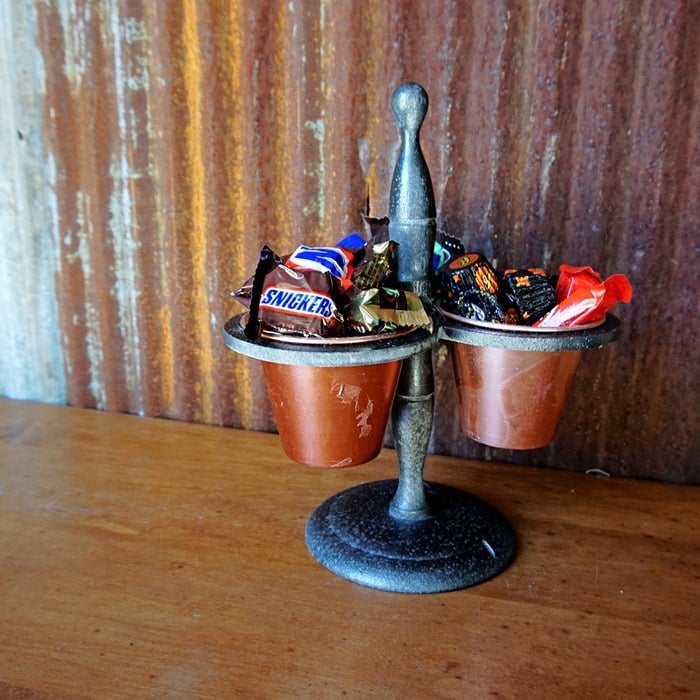 You can use all kinds of things to display your favorite candy. This condiment holder is a thrifty find spray painted with Rustoleum Hammered Spray Paint.
