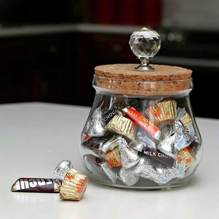 Add a furniture knob to a cork-lidded glass dish and fill the dish with seasonal candy.