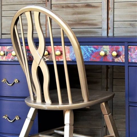 All you need are 5 minutes and a can of spray paint to give an old chair new life. This gold beauty is the perfect companion to my DIY painted desk, especially with the gold-painted knobs.
