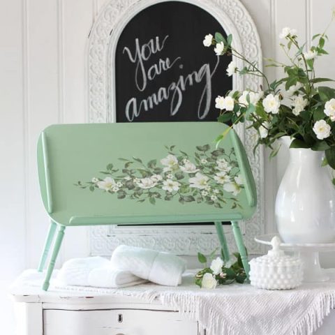 You will not believe the before of this absolutely stunning vintage style folding tray. The color and floral design makes this a piece anyone would be happy to display.