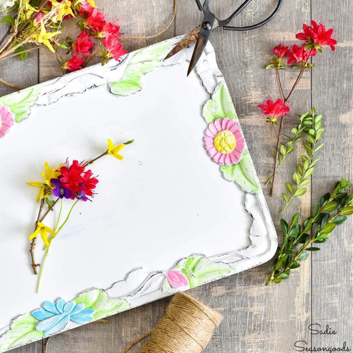 Sarah from Sadie Seasongoods found a great carved wooden tray at the thrift store, but the color was not her style. A little paint in pretty pastel colors is all this beauty needed! The details are gorgeous.