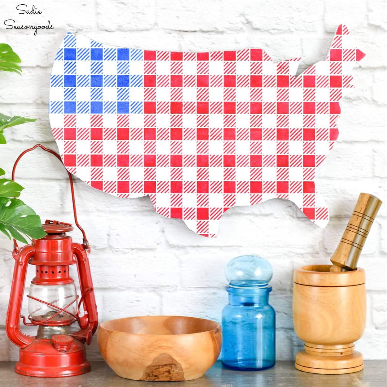 Combine a favorite buffalo plaid look painted on a world map. This is a great wall art piece to show a little patriotism.
