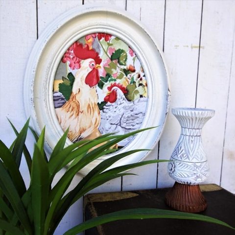 Using framed placemats is the easiest way to make affordable wall art! This chicken wall decor is a favorite of my repurposed projects.