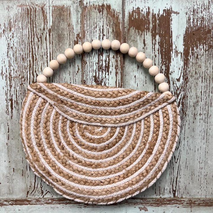 Craft your own fashionable purse made with a round placemat and wood beads. This is the perfect tote for summer parties or barbecues.