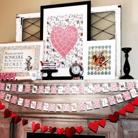 Explore your artistic side and decorate a mantel or buffet with a creative Queen of Hearts playing card themed display.