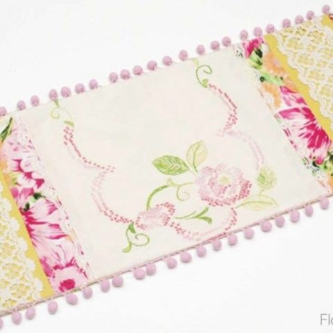 This beautiful table runner uses a mix of vintage linens and quilted fabric scraps. The colors used are perfect for spring or any cottage core decor.