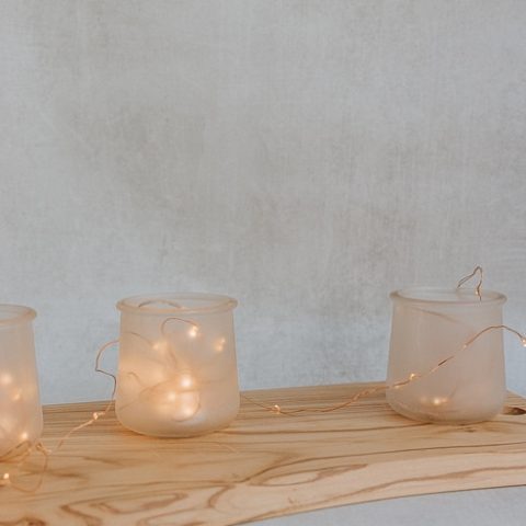 You know those cute glass yogurt jars at the supermarket? Don't throw them away. They are the perfect size for votive candle holders. Paint them or add a frosted glass look as shown here.