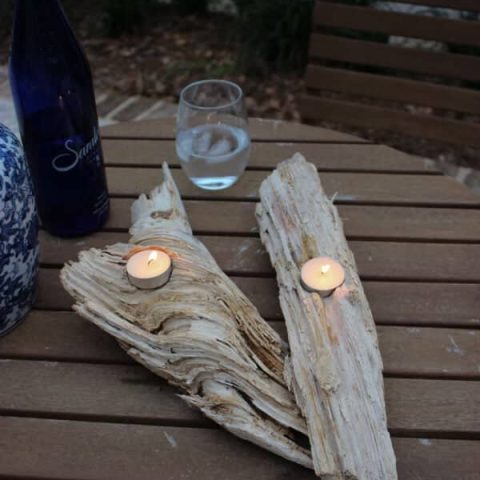 Here is another look for found driftwood that is gorgeous! Make a tabletop display to hold tea lights. What a great look for an outdoor celebration.