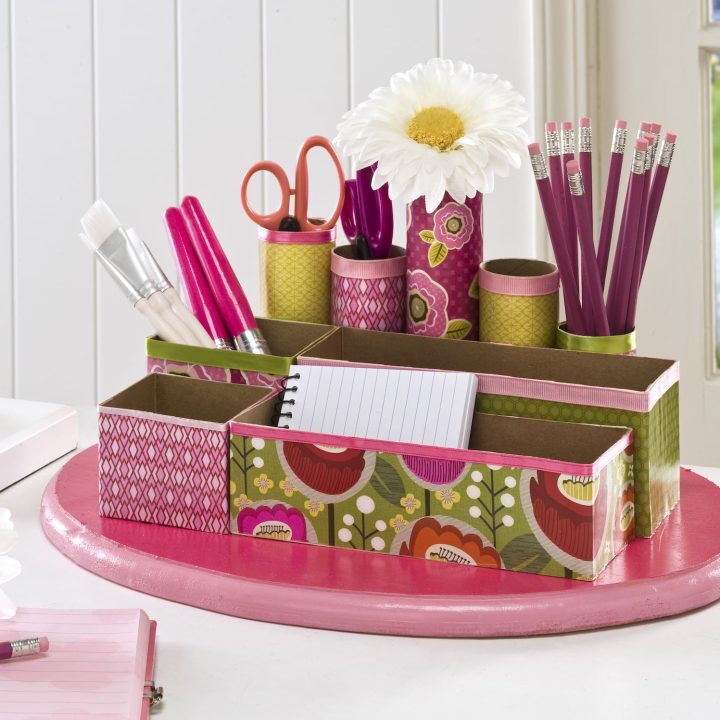 Organize your desk supplies on a budget with recycled food boxes. Use paper in different colors and patterns to match your decorating style.
