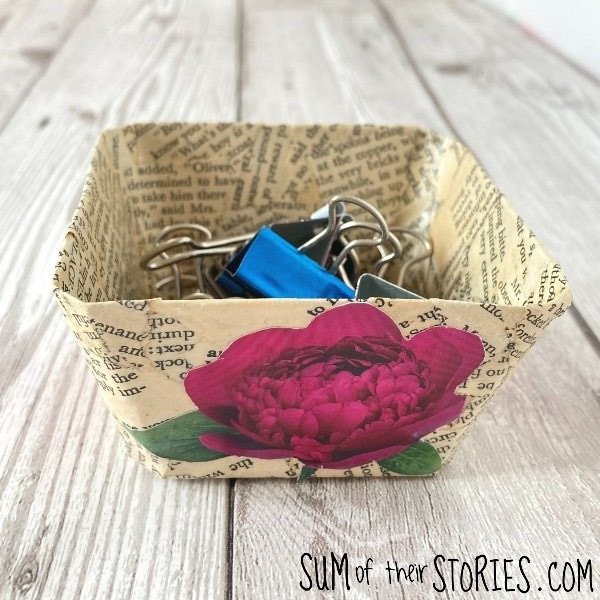 Empty olive containers make great storage for all kinds of small items like paper clips, push pins and other office or craft supplies. Decorate them with old book pages for a unique look.