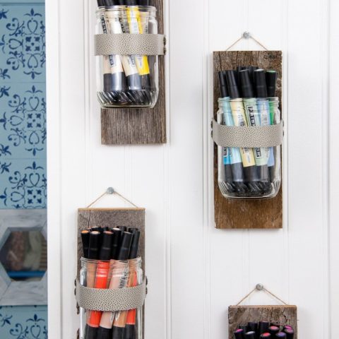 Creative storage ideas are always useful, especially for a craft room and office. These hanging wall jars are perfect to hold craft supplies or to use as vases. They are made from empty peanut butter jars!