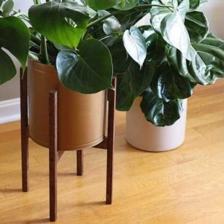 Pam made the coolest mid-century modern plant stand from an old popcorn tin. Spray paint it any color you like, but we love the gold.