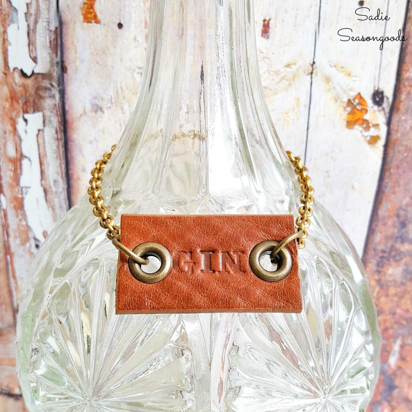 Add a touch of elegance to glass decanter bottles by hanging some DIY leather labels for home bar decor. These are super easy to make and you can customize them.