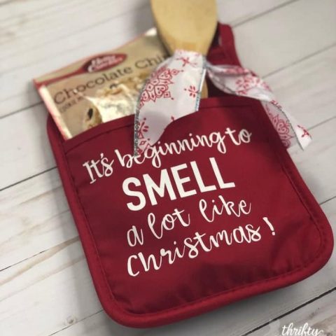 These Christmas potholders make excellent gifts! Start with pot holders from Dollar Tree in whatever color you like. Add a wooden spoon and some baking mix to create a sweet treat. Take it to the next level by customizing it with a fun quote.