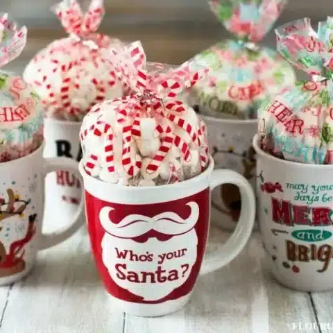 Here is a simple recipe for homemade peppermint hot chocolate. Wrap it in festive cellophane bags with marshmallows and place it inside a charming holiday mug. This is a simple and budget-friendly DIY Christmas present.