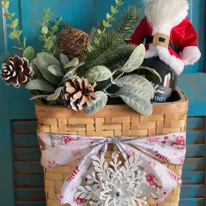 Do you have a gnome lover on your gift list? Learn how to make the cutest Santa gnome wine bottle topper. If they are not wine drinkers, add it to sparkling apple cider. It looks so sweet tucked into a Dollar Tree basket with some faux greenery.