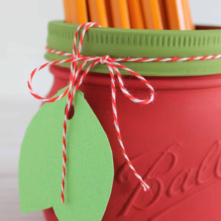 This charming apple pencil holder, made from a mason jar, is a great way to recognize teachers for their hard work. It makes a great holder for pencils and will look cute on a desk.
