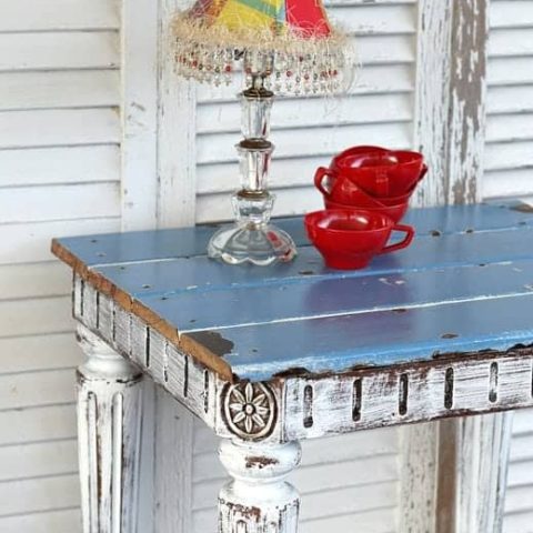 Add character to any tabletop using reclaimed wood, decoupaged paper, stencils, bead board panels, paint, wood frames, and more.
