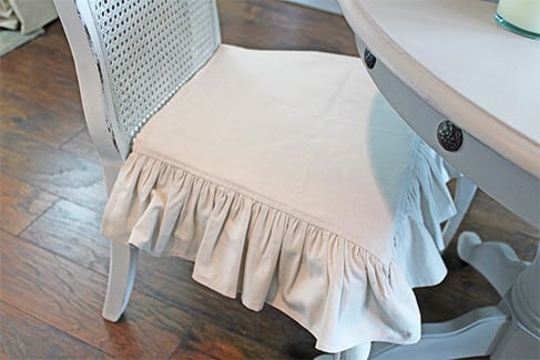 This gorgeous cane back chair was a $20 thrift store find. Annie Sloan chalk paint brightened it up and the ruffled seat cushion finished it off perfectly!