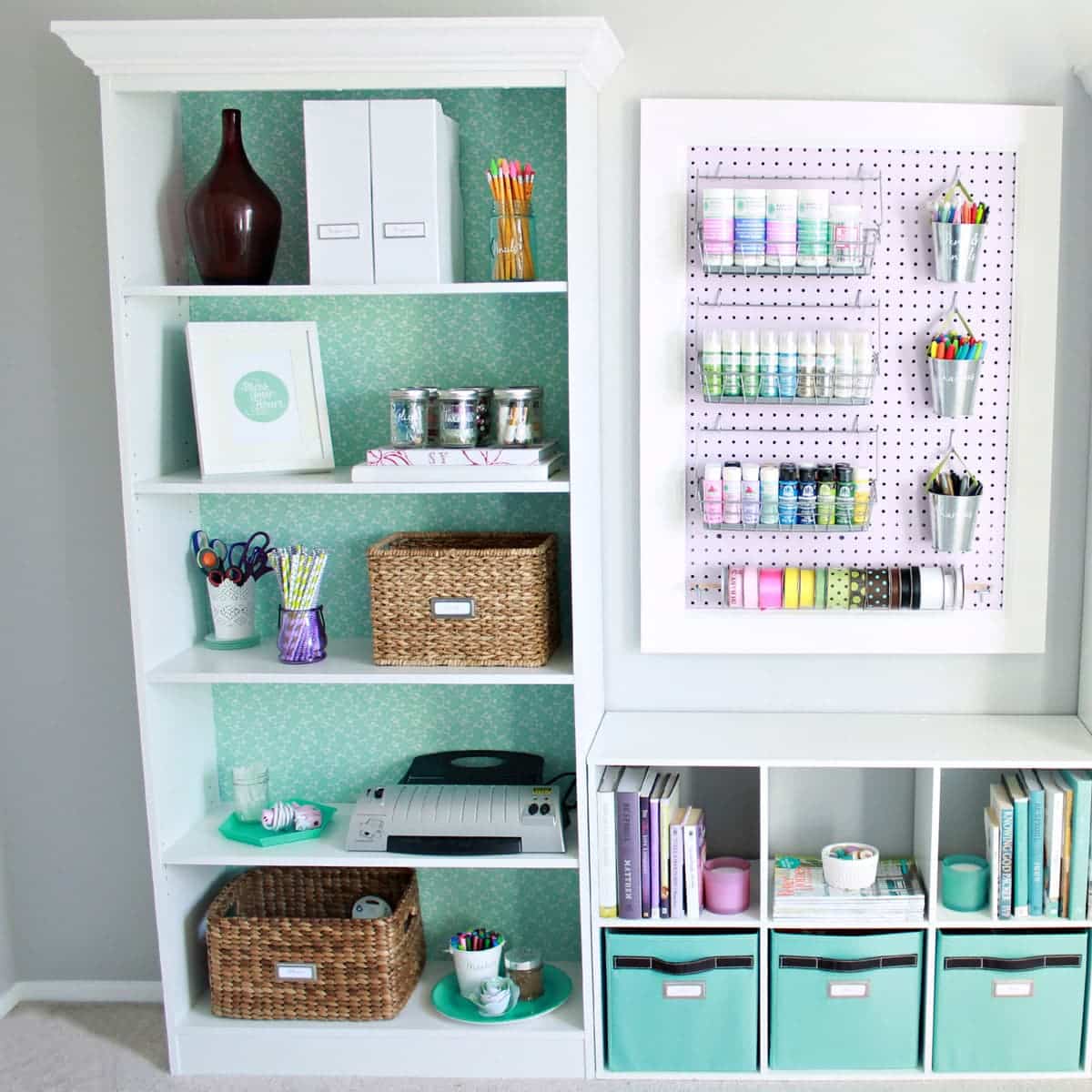 Learn how to give a plain bookcase a fun makeover using wrapping paper for a burst of color and pattern! This is a great way to add colorful storage to your home office.