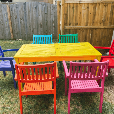Go bold with your outdoor furniture makeover by using a collection of vibrant rainbow colors. This is a statement piece that will wow friends and family! Follow along with this simple, detailed guide to achieve professional results in no time!
