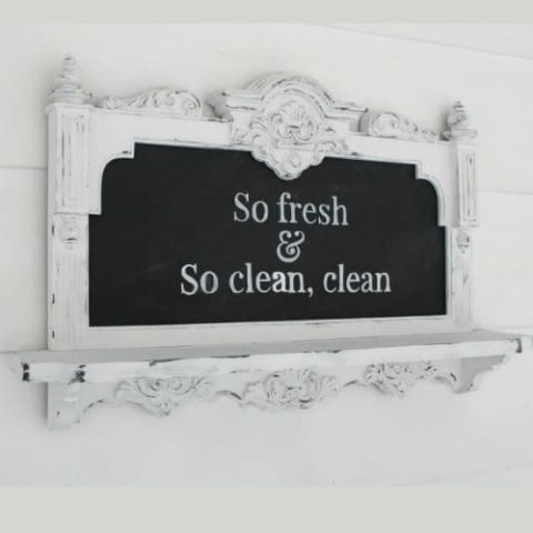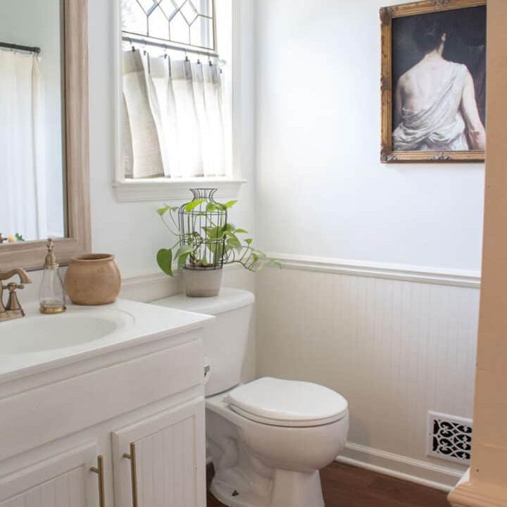 There are so many great decorating tips in this bathroom refresh. The decorative window frame was a flea market find. It is stunning. Another money-saving decorating tip is to create large artwork with thrift store frames and art prints. You can have them printed online for cheap!