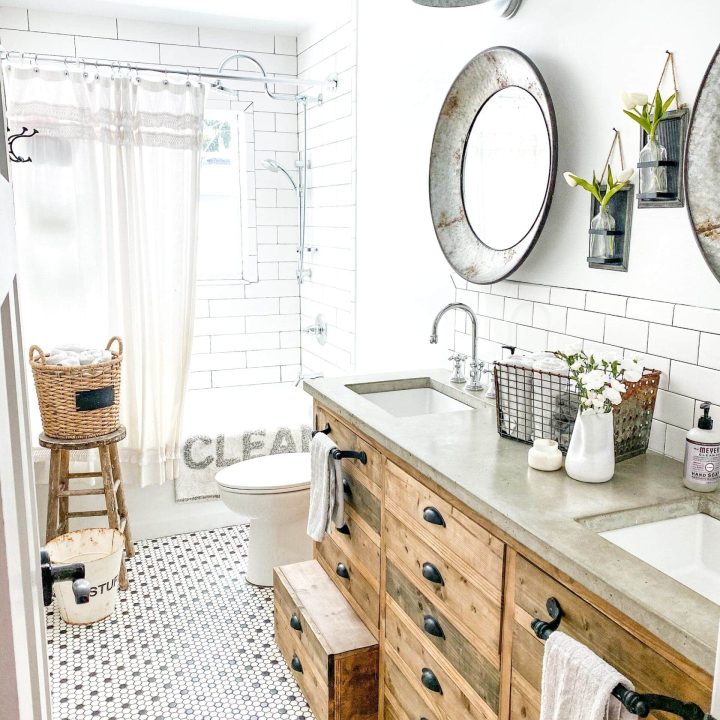 Inexpensive farmhouse decorations can transform a small bathroom into a warm and inviting space perfect for family and guests.