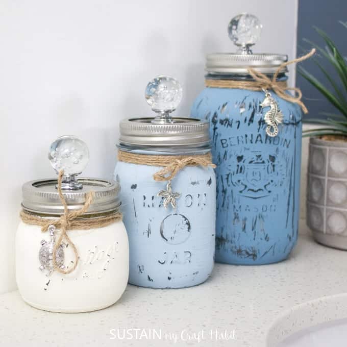 Transform your bathroom with a hint of coastal charm by painting mason jars in soft shades of blue and white. Add pretty glass knobs to the lids. These can hold q-tips, cotton balls and other bathroom accessories.