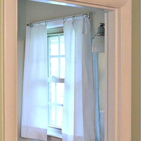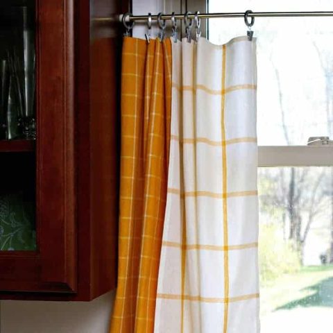 Pick up dish or tea towels that appeal to you and hang them in a window using clips on an ornamental rod. It is seriously the easiest way to make curtains. With this DIY, you can change them our for every season or holiday.