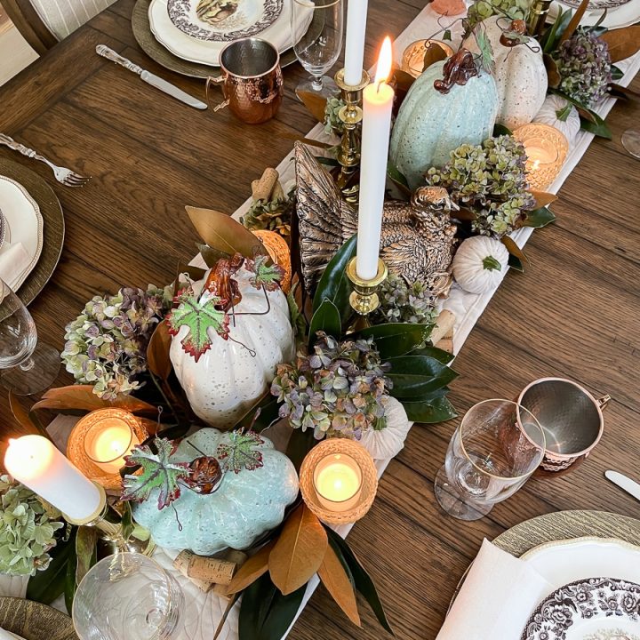 Christy from Our Southern Home shares tips for creating an elegant tablescape including layering items and adding brass candlestick holders.