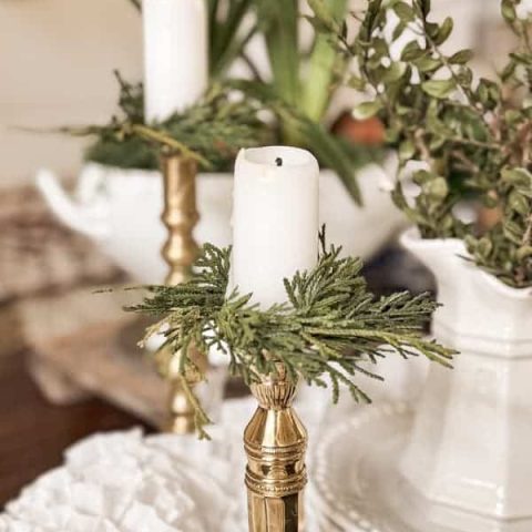 These vintage brass candlesticks get a festive touch when paired with cedar napkin rings used as candle rings.