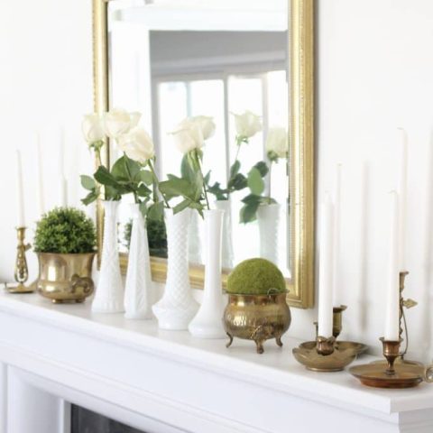 An elegant mantel display using brass candlesticks and milk glass found at a thrift store.