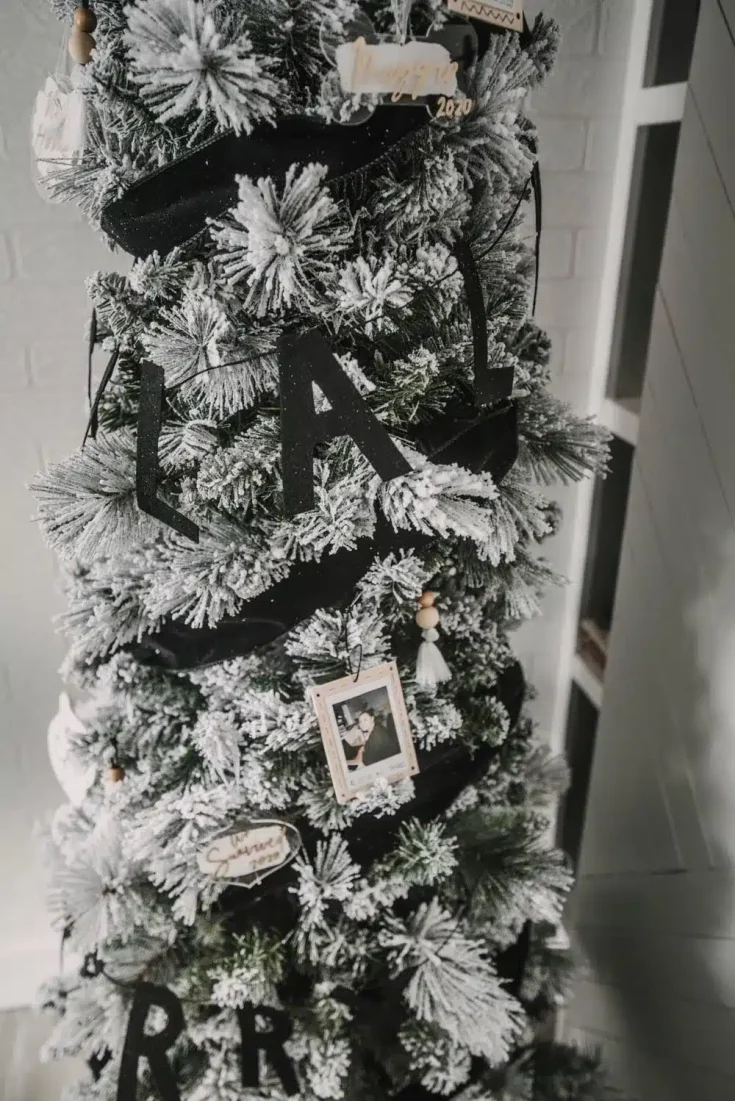 This skinny flocked tree is packed with playful DIY decor in an unexpected black, white, and wood color scheme, bringing cozy holiday cheer.