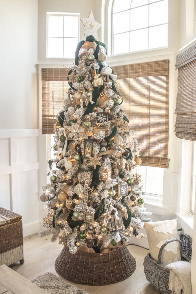 Create a cozy woodland Christmas tree with lush green velvet ribbon, rustic burlap, and charming woodland creatures for a warm and nature-inspired holiday look.