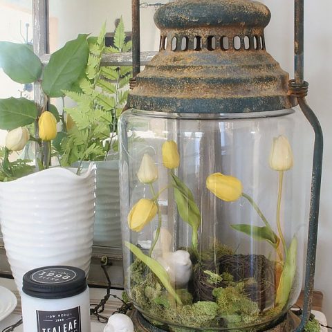 Bring the beauty of spring indoors and brighten up your home decor by adding tulips to an old lantern. This vignette is just lovely and it couldn't be easier to create!