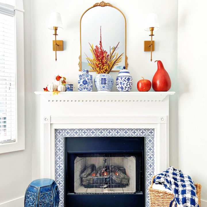 Refresh your fall decor with a crisp blue, white, and orange mantel design. This provides a clean, modern twist on traditional autumn colors.