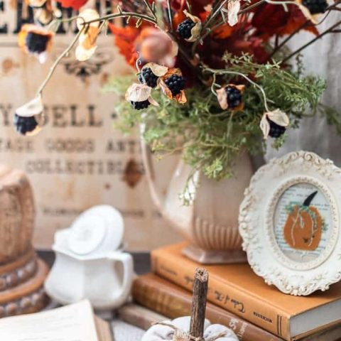 Craft a cozy fall vignette with vintage charm. Learn how to blend old books, ironstone, pumpkins, and leaves for a warm, inviting seasonal display.