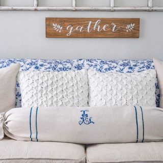 Transform that canvas drop cloth into a fabulous faux French grain sack bolster pillow! It’s got a charming hand-stitched monogram and painted grain sack stripes for a touch of Farmhouse. How chic is that?
